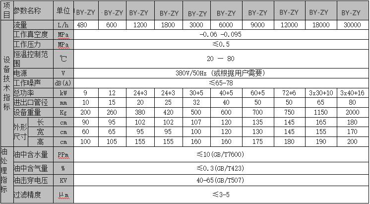 四、BYB系列高效真空变压器油滤油机性能参数:
